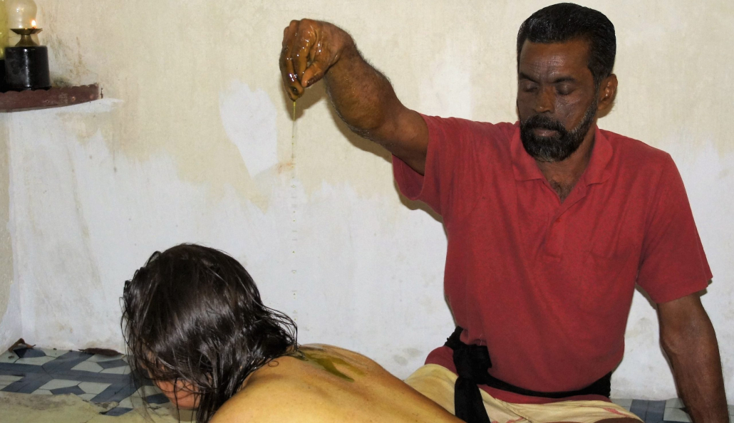 Dabei verwendet Gurukal Babu Payyani warmes hochwertiges Kräuteröl, das er individuell auf die zu behandelnde Person abstimmt. Das Kräuteröl wird auf den Körper aufgetragen und in langen, dynamischen Bewegungen eingearbeitet, so dass
